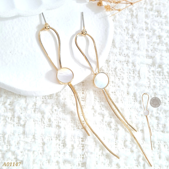 Arete en rodio con cadena doblada y dije en el centro de nácar
