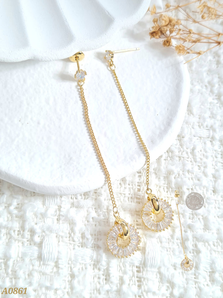 Arete en rodio con zircón, cadena y colgante circular con detalles en zircones