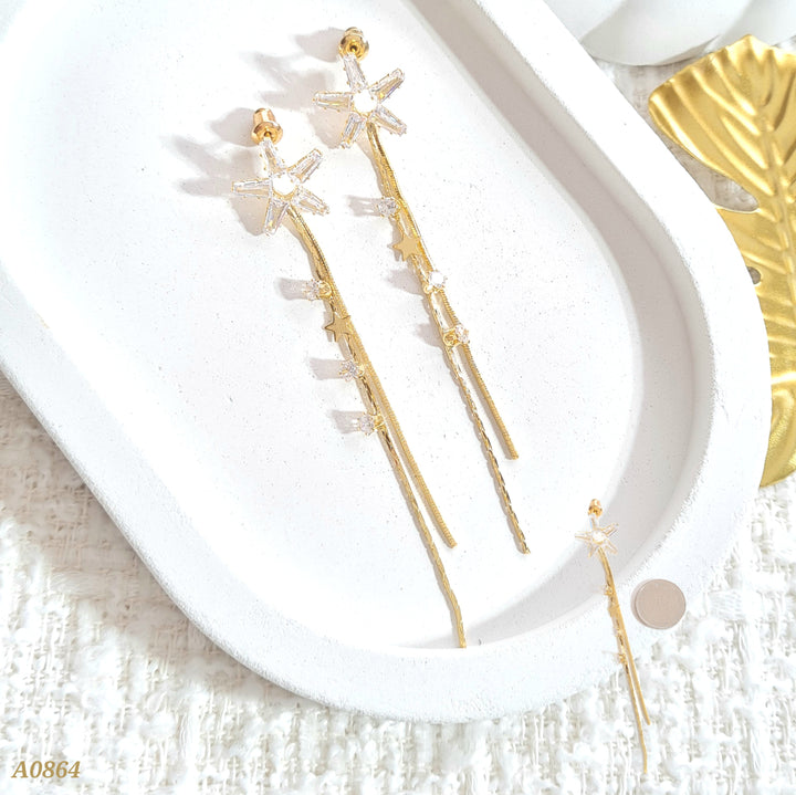 Arete en rodio con forma de estrella, cadenas con detalles en zircones y estrellas