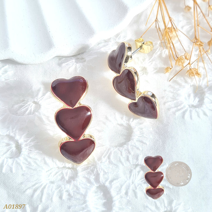 Arete triple corazón vinotinto A01897