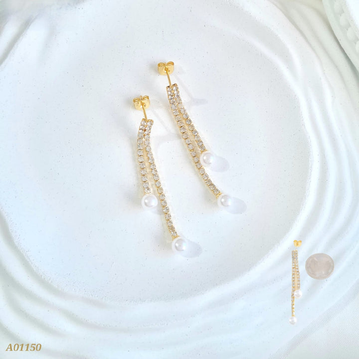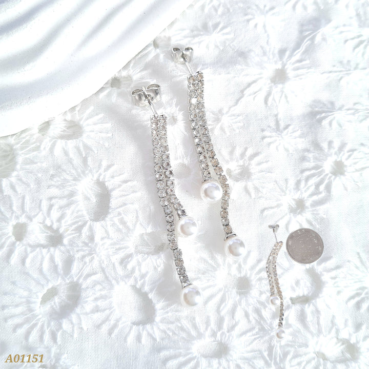 Arete en rodio con cadenas en zircón y perla al final