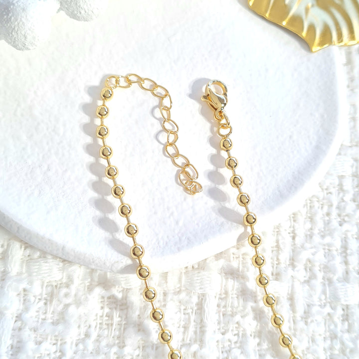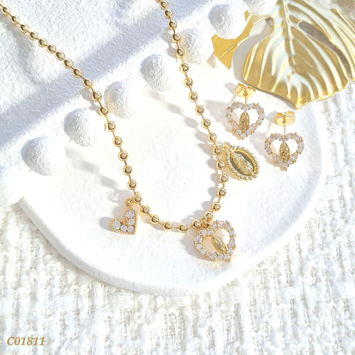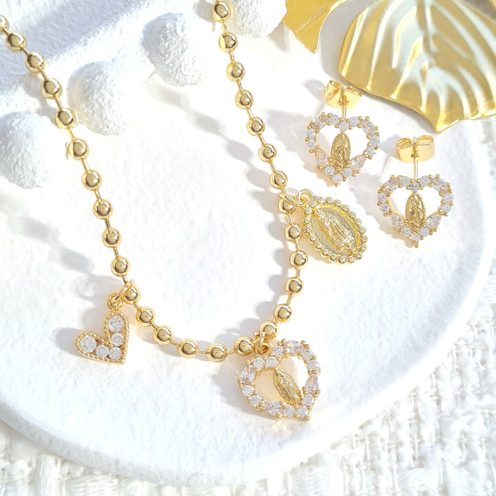 Cadena rodio con balines y dijes en forma de corazón, virgen y topos a juego