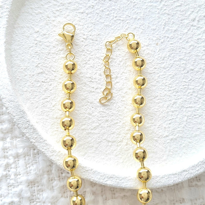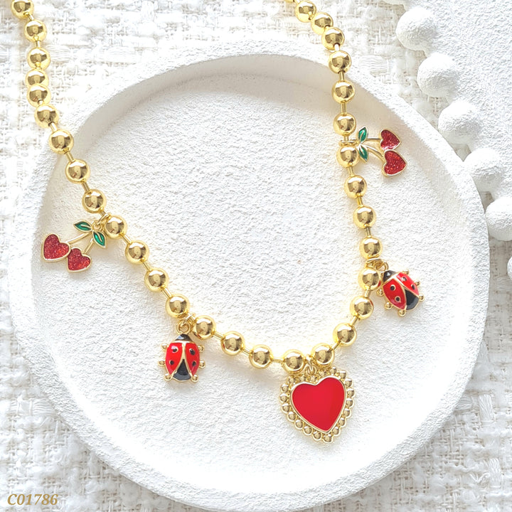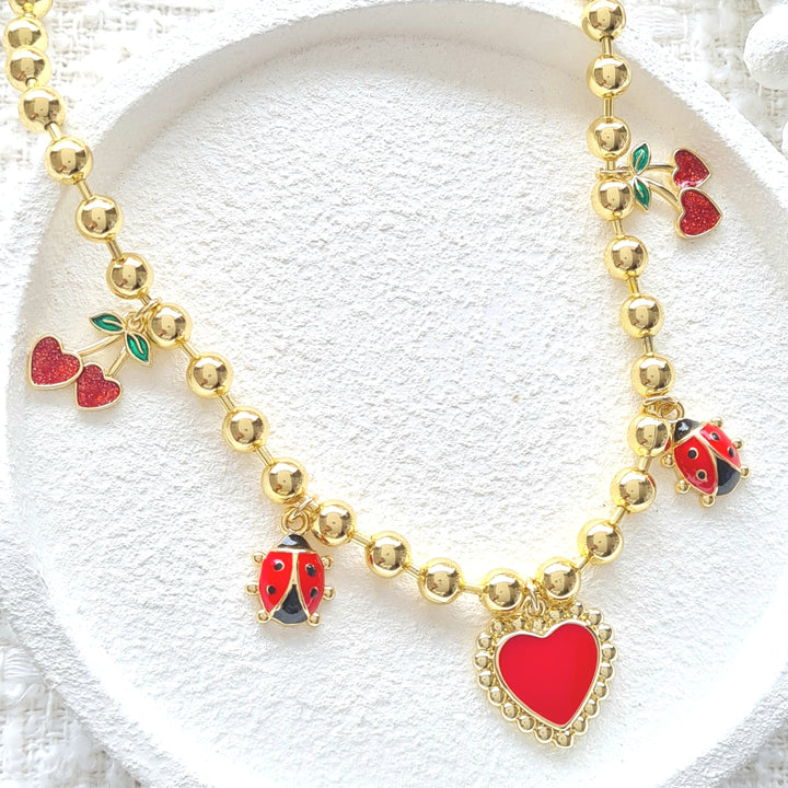 Cadena balines dijes cereza, mariquita y corazón C01786