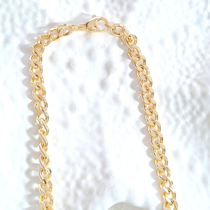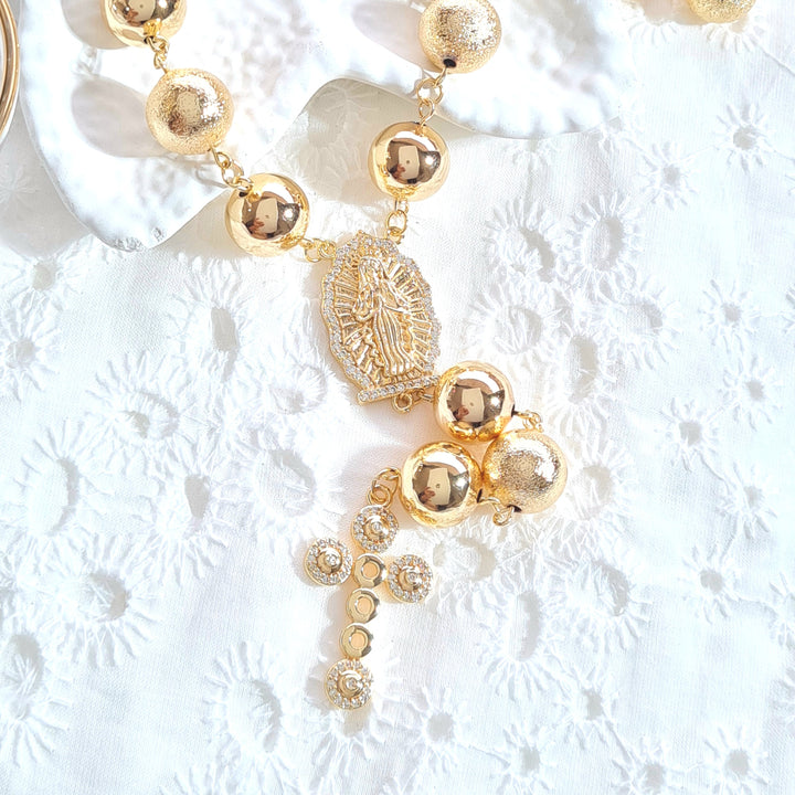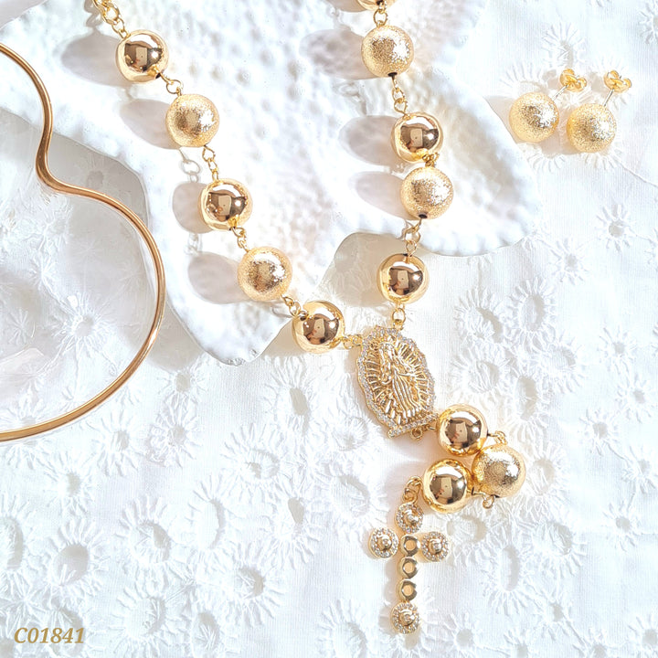 Cadena en rodio con balines mirellados, dije de cruz y virgen