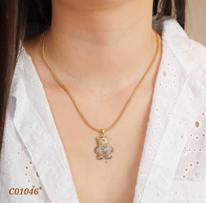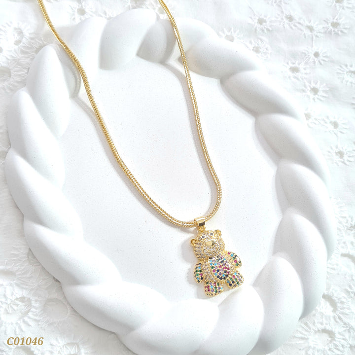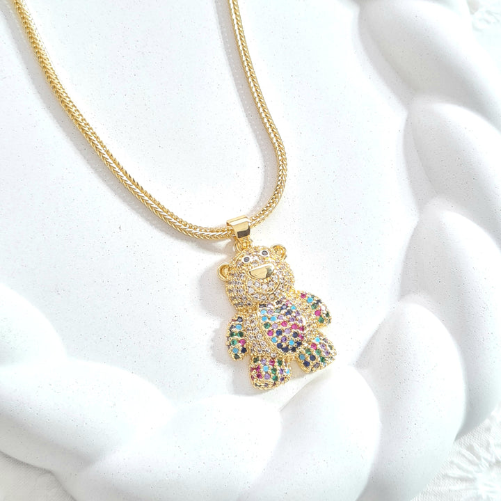 Cadena en rodio, con dije en forma de oso con detalles en zircones multicolor