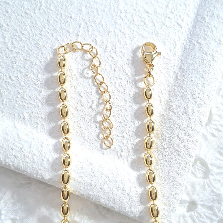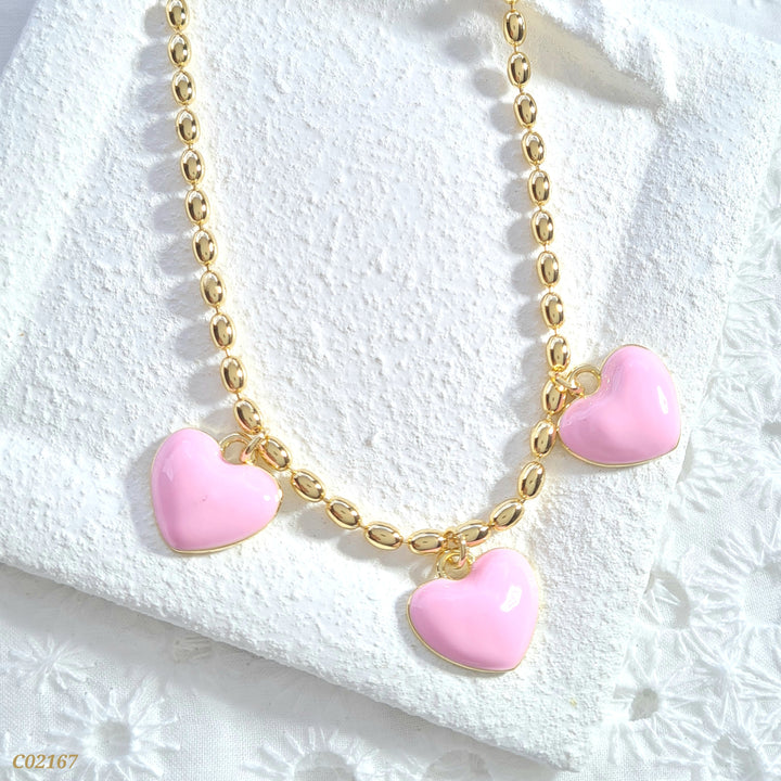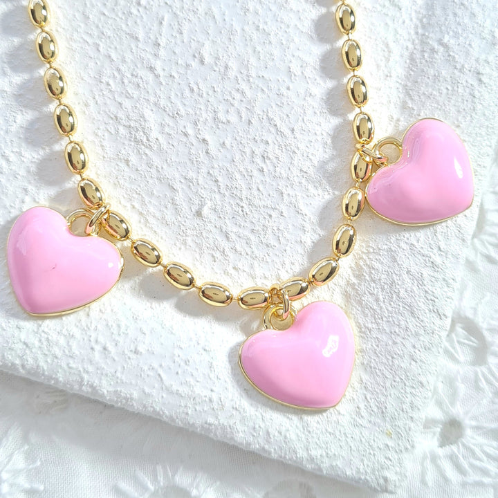 Cadena rodio en balines y dijes en forma de corazones rosa