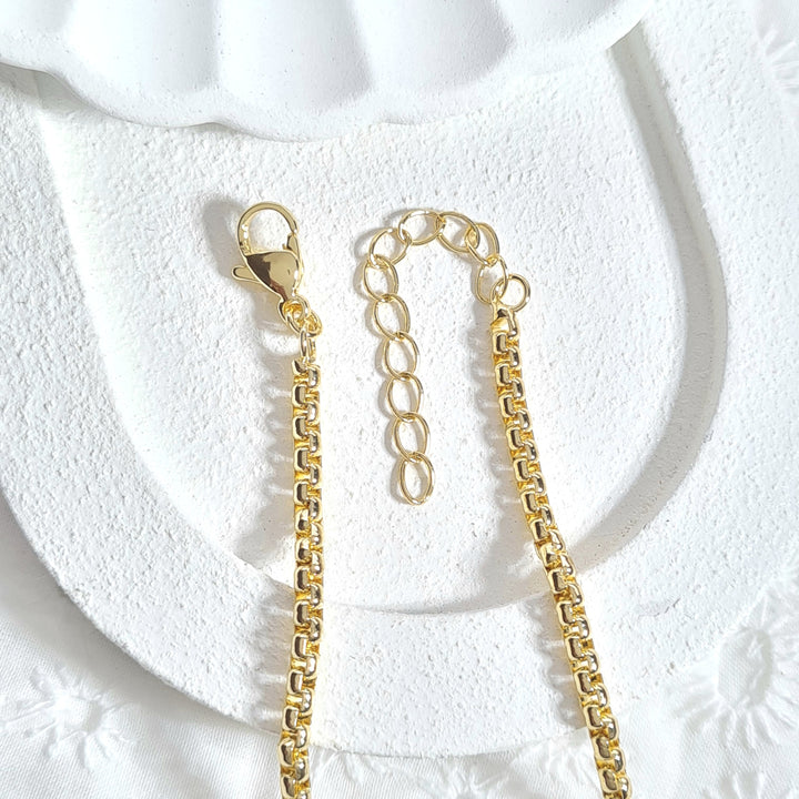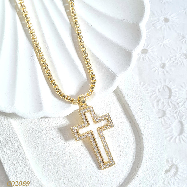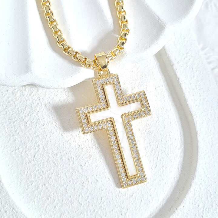 Cadena en rodio con textura y dije grande en forma de cruz con zircones y detalles en nácar