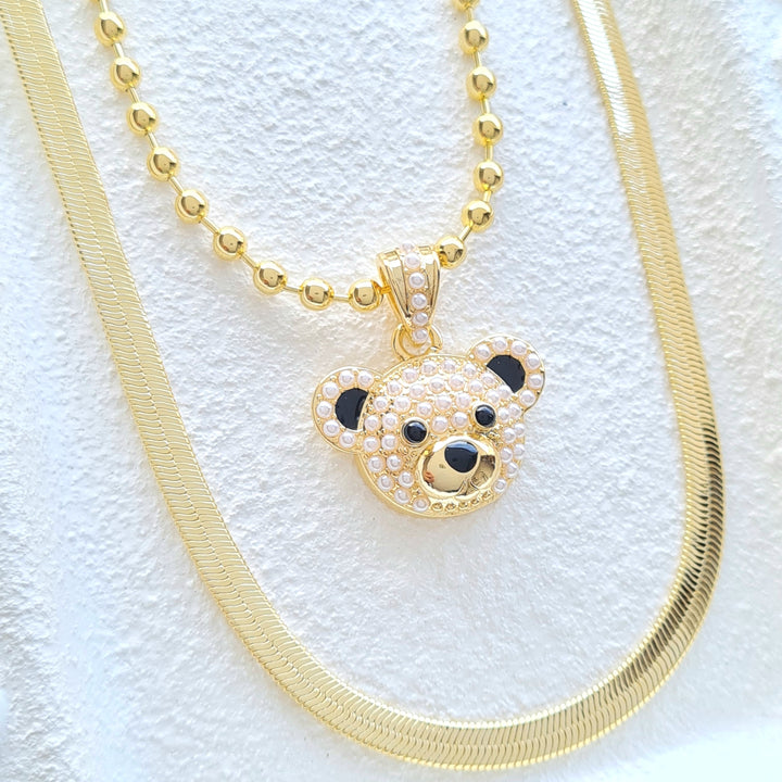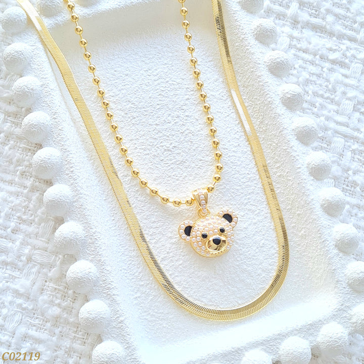 Cadena en rodio doble con textura balines y plana, dije en forma de oso detalles en zircones