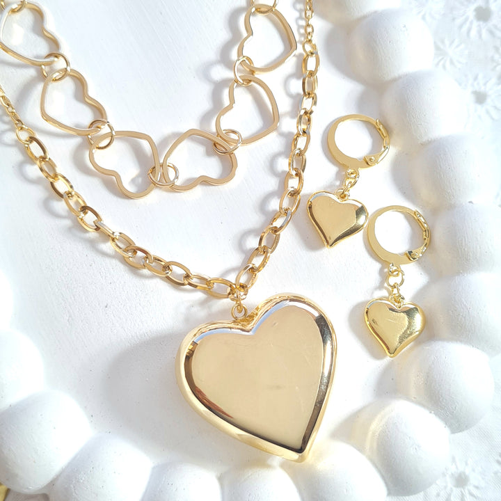 Cadena en rodio doble con doble corazón, detalles en textura y aretes a juego
