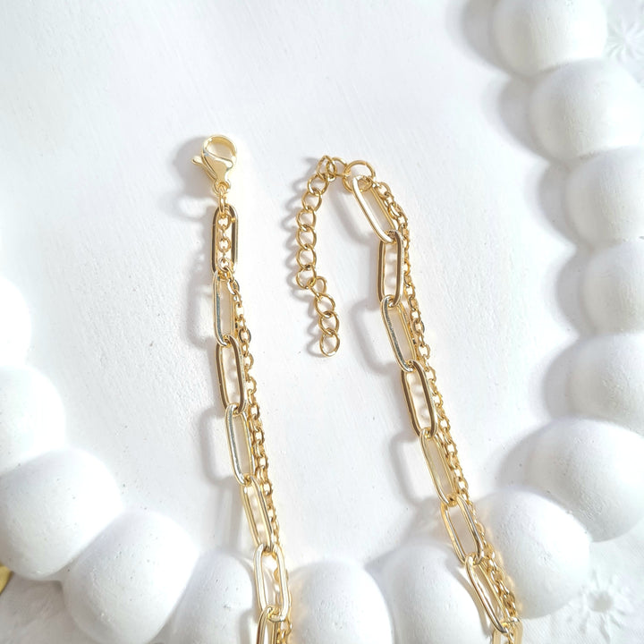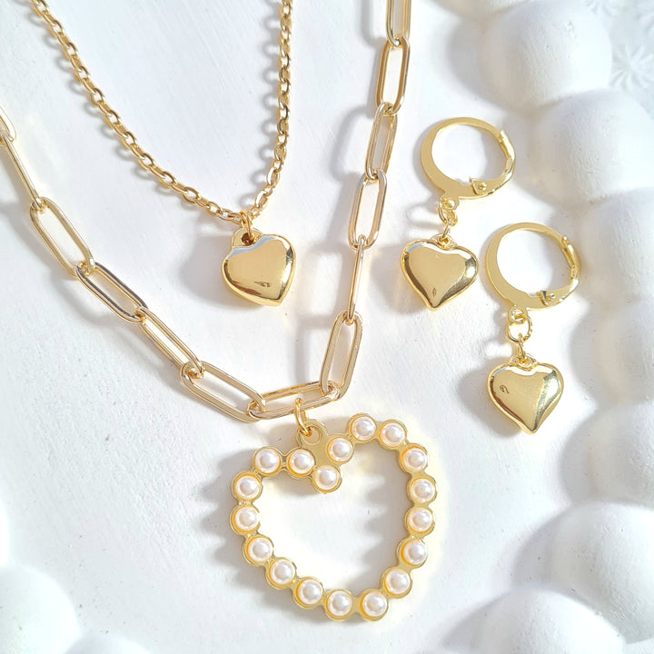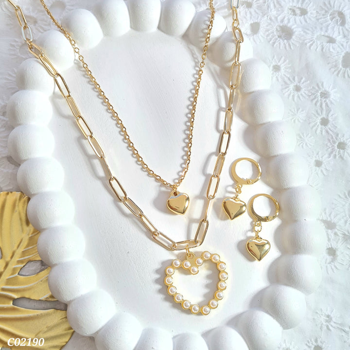 Cadena en rodio doble con doble corazón, detalles en perlas y aretes a juego