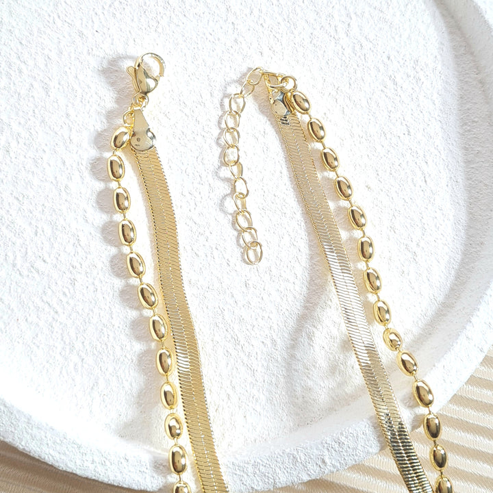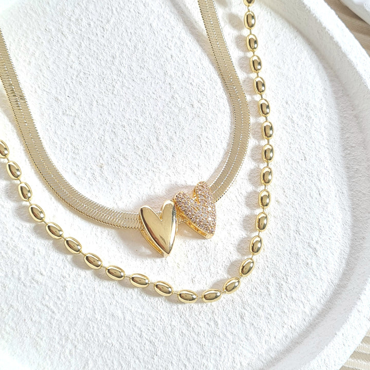 Cadena doble en rodio con balines y dijes en forma de corazones con detalles en zircones
