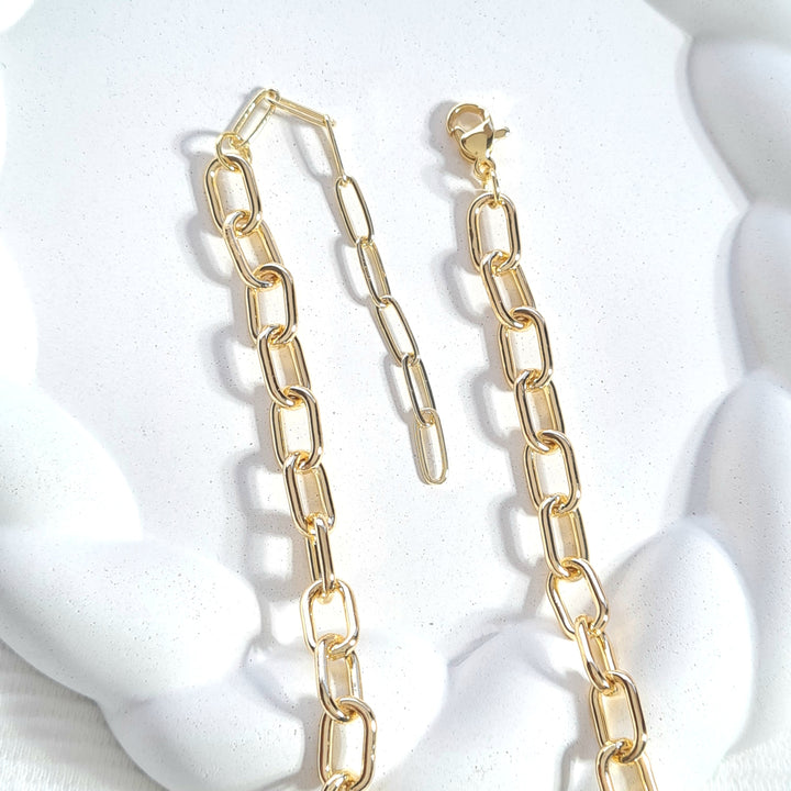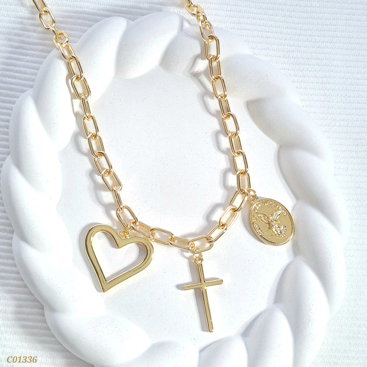 Cadena rodio eslabones dijes en forma de corazón, cruz y san miguel