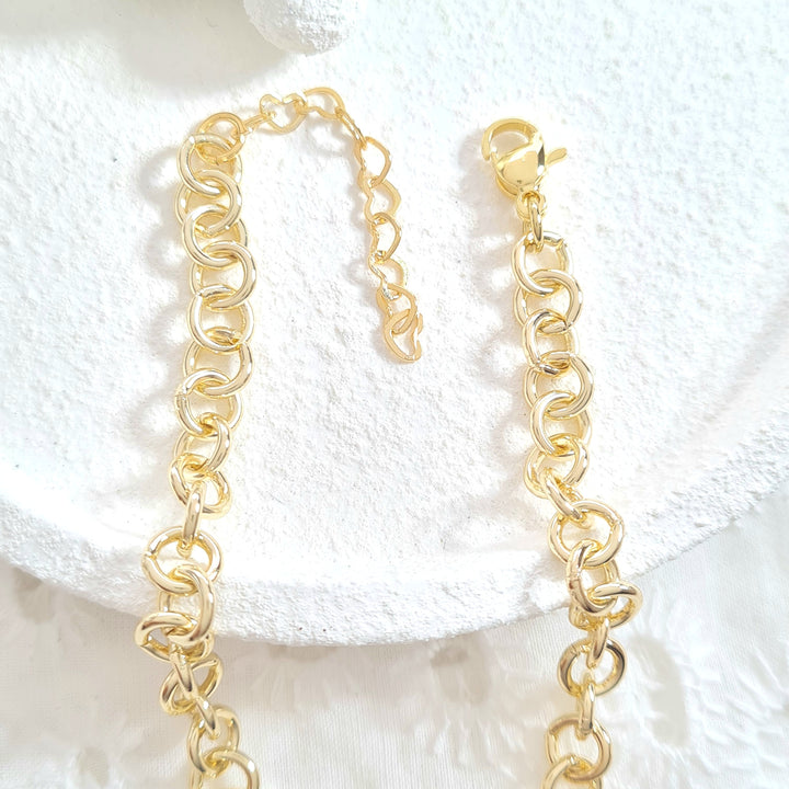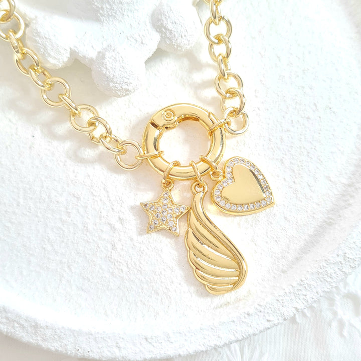 Cadena rodio eslabones con dijes de estrella, ala, corazón y detalles en zircones