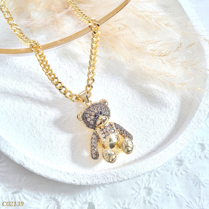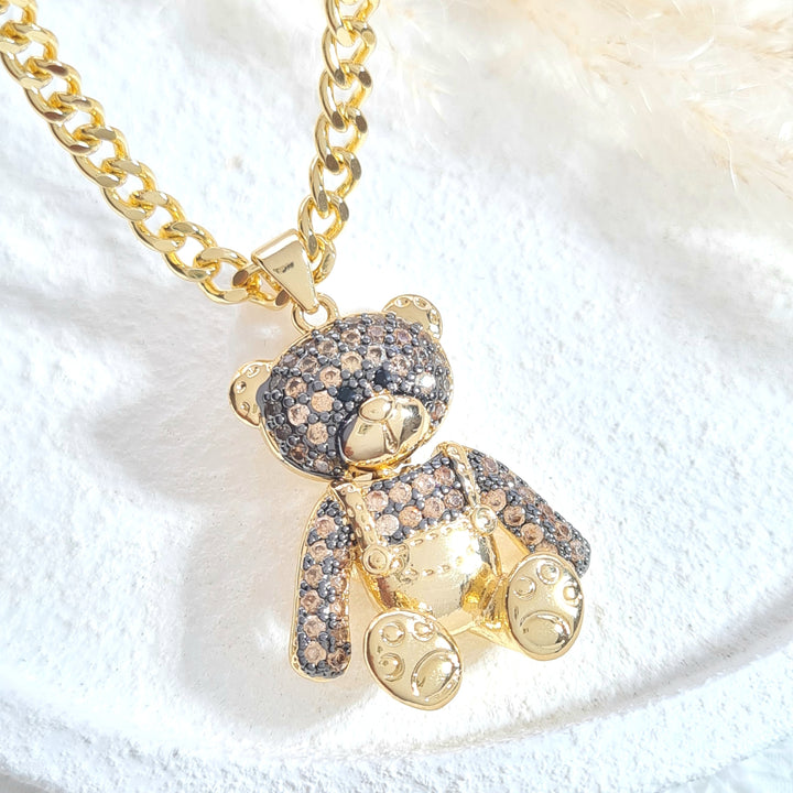 Cadena en rodio con textura y dije en forma de oso con detalles en zircones negros