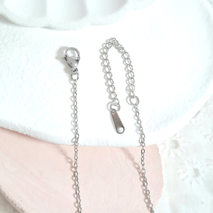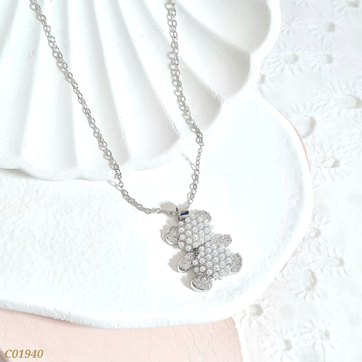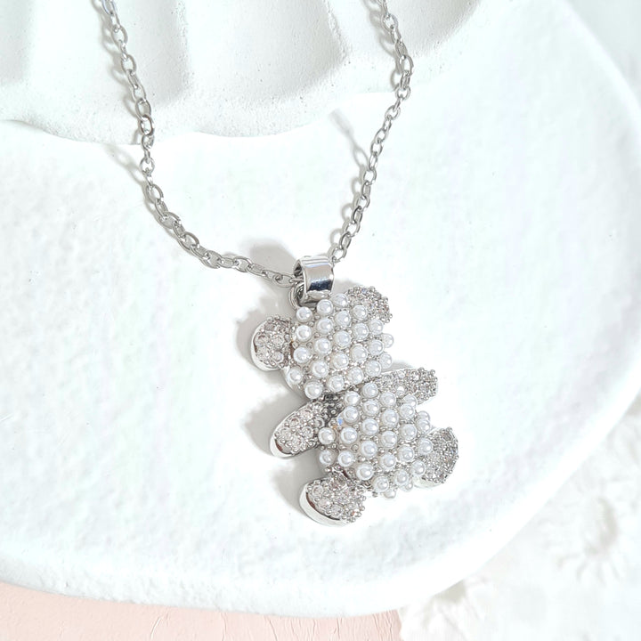 Cadena plateada en rodio y dije en forma de oso con detalles en zircones y perlas