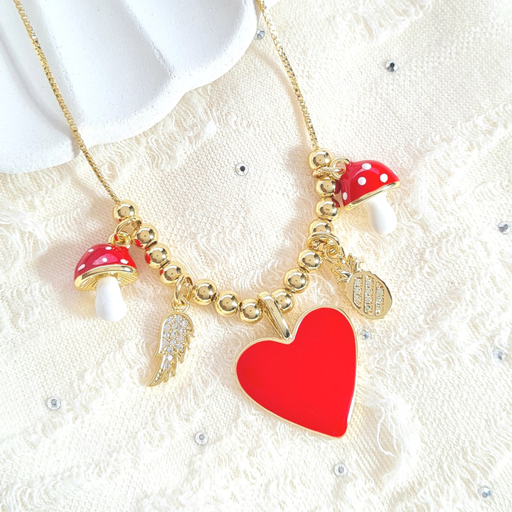 Cadena rodio ajustable dijes hongos/ piña y corazón rojo
