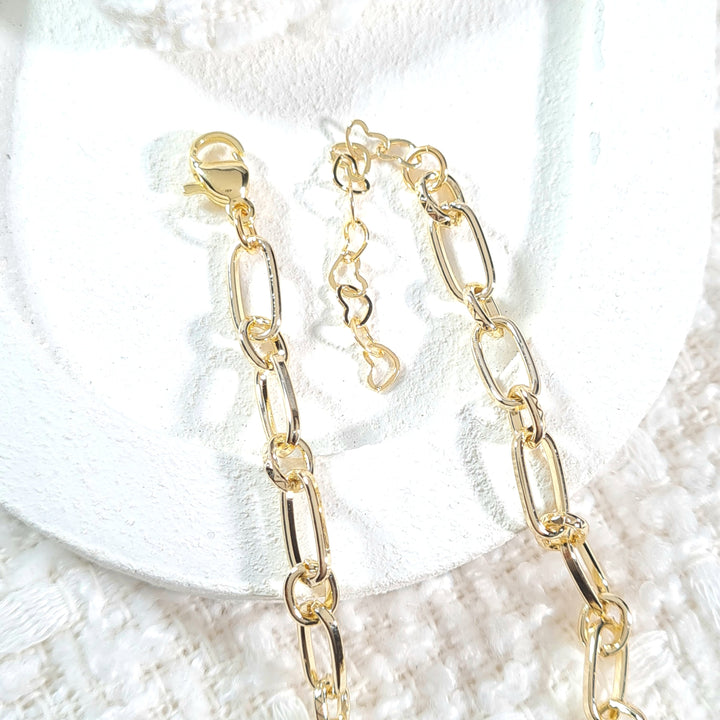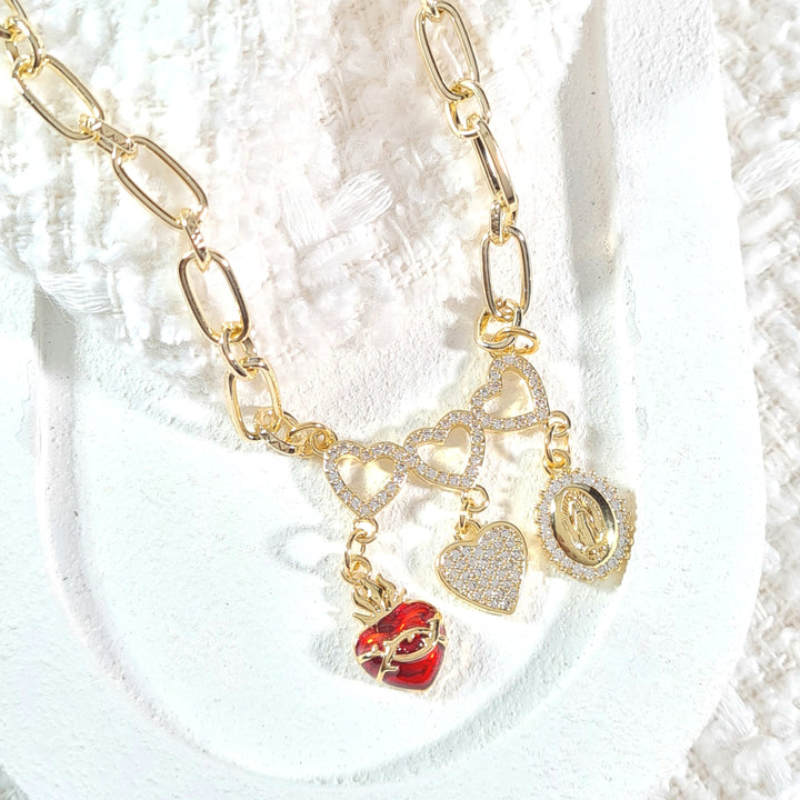 Cadena en rodio, textura de eslabones, dijes en forma de sagrado corazón, corazón y virgen con detalles en zircones