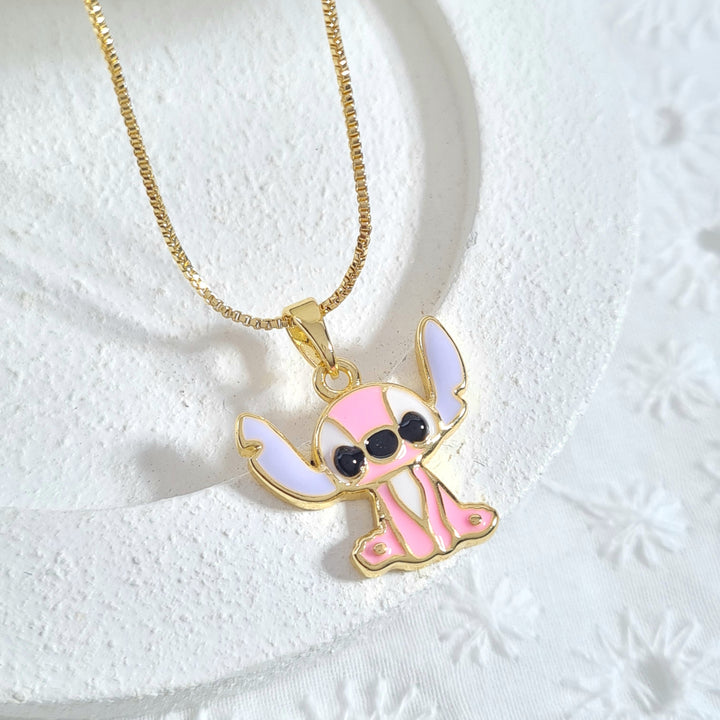 Cadena rodio con cadena ajustable y dije en forma de stitch rosado
