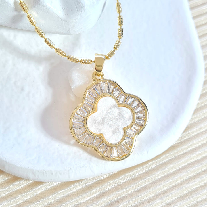 Cadena en rodio, sistema ajustable, dije en forma de trébol grande blanco con detalles en zircones
