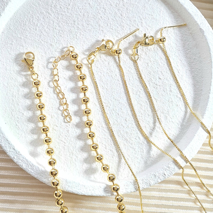 Cadena en rodio triple con textura y dijes en forma de trébol, cereza y corazón rojo
