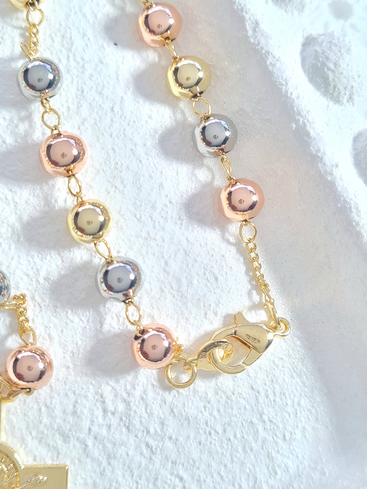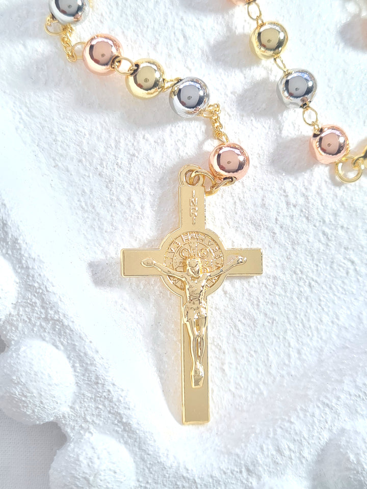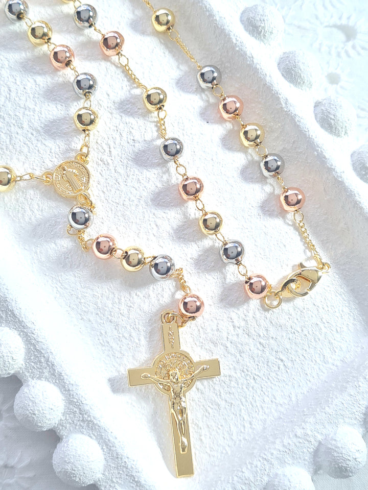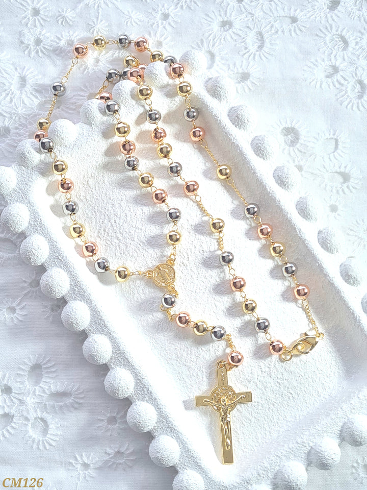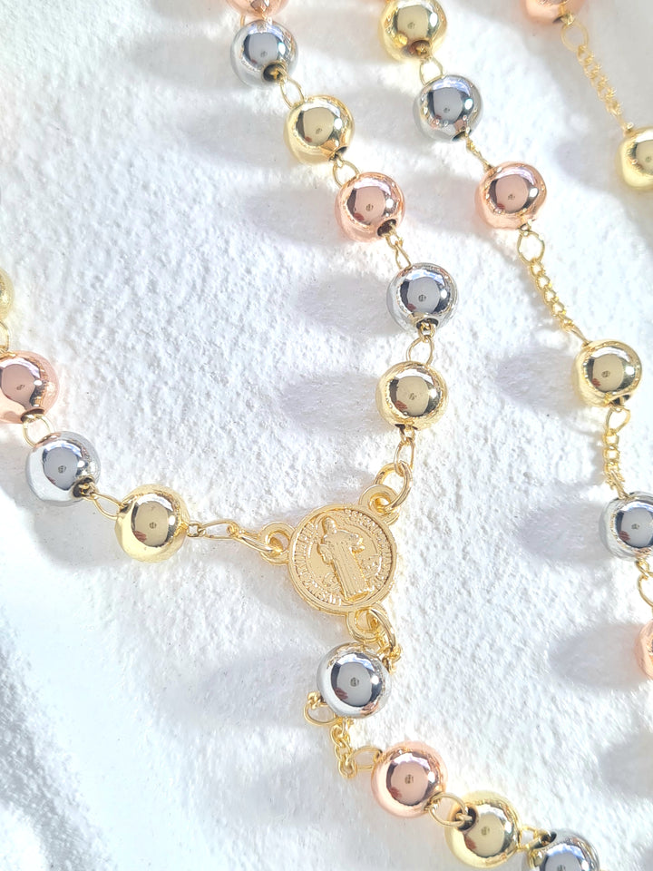 Camándula rodio balines lisos tres oros, dije san benito zircones y cristo