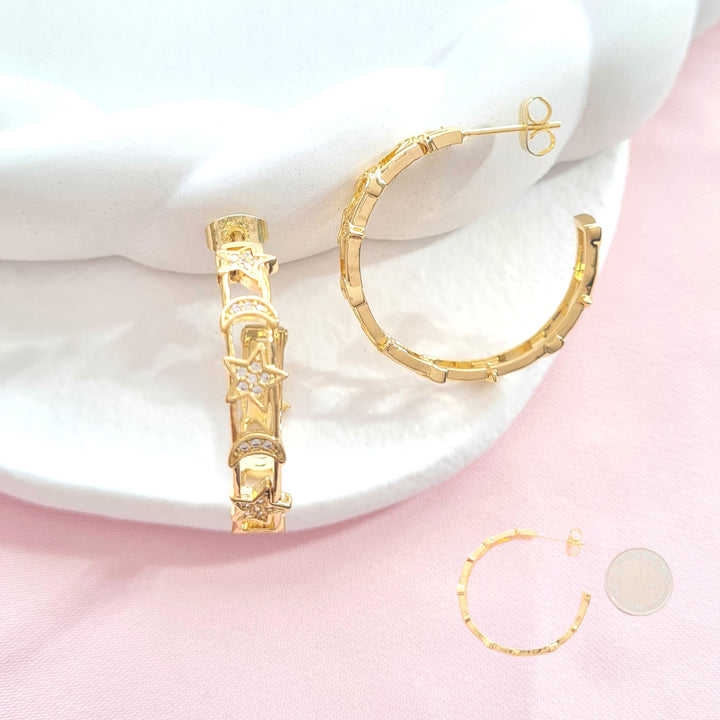 Candonga en rodio redonda con dijes en forma de estrellas y lunas