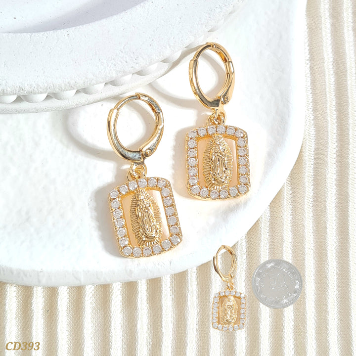 Candonga en rodio con dije en forma rectangular, imagen de virgen y detalles en zircones