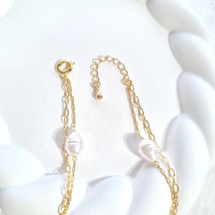 Collar doble en rodio con cadena con perlas, cadena central y dije en forma de corazón