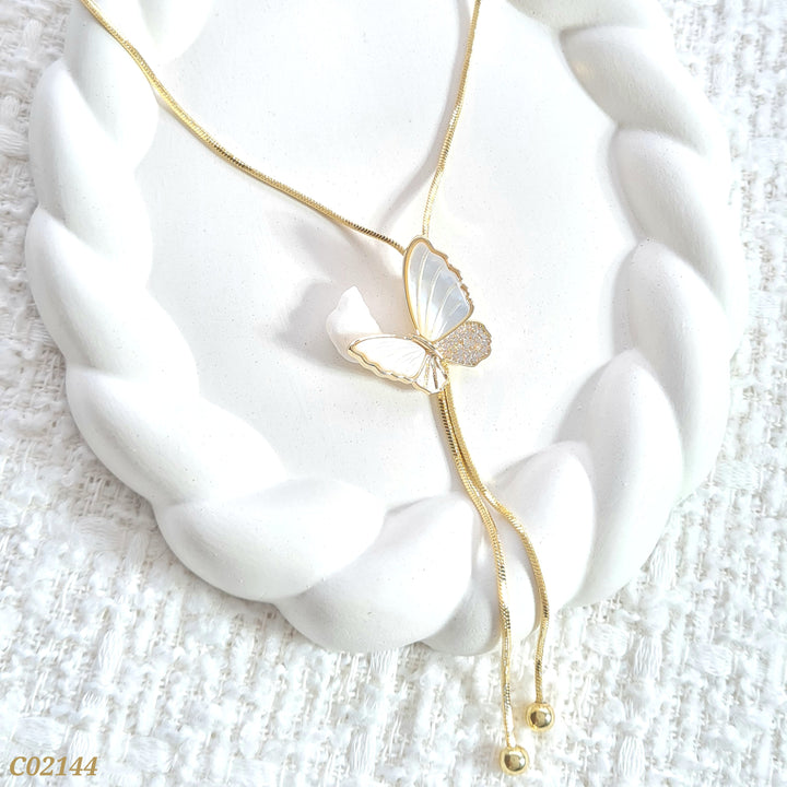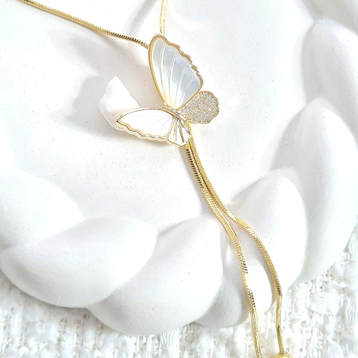 Collar tipo corbatín ajustable, dije con forma mariposa y detalle en nácar
