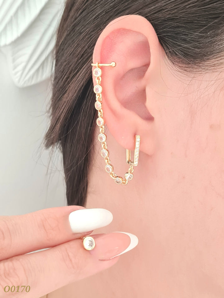 Orejera en rodio con cadena en zircones, candonga rectangular con detalle en zircones y topo zircón