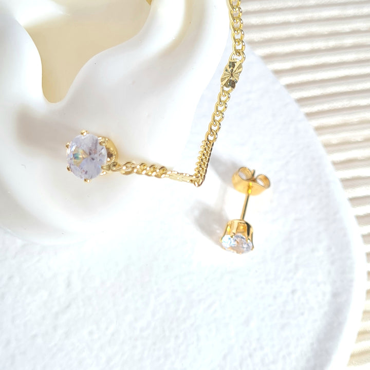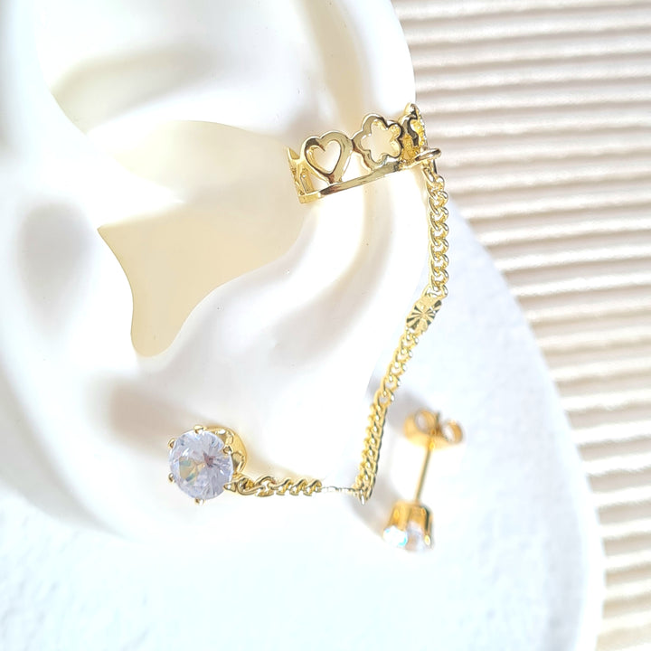 Orejera en rodio con cadena, earcuff de corazones, estrellas y flores con topo zircón
