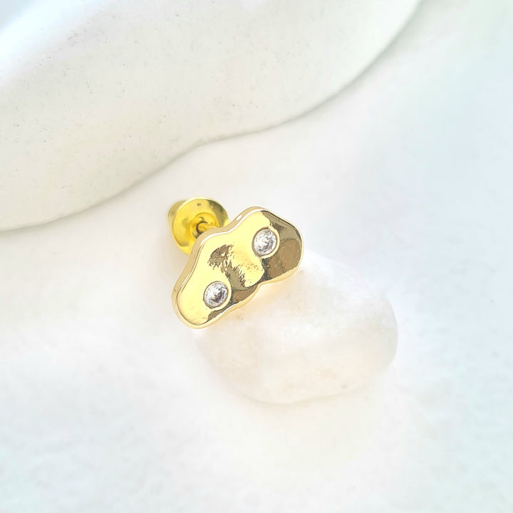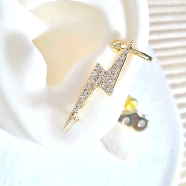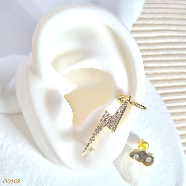 Orejera en rodio, con forma de rayo y topo de nube con detalles en zircones