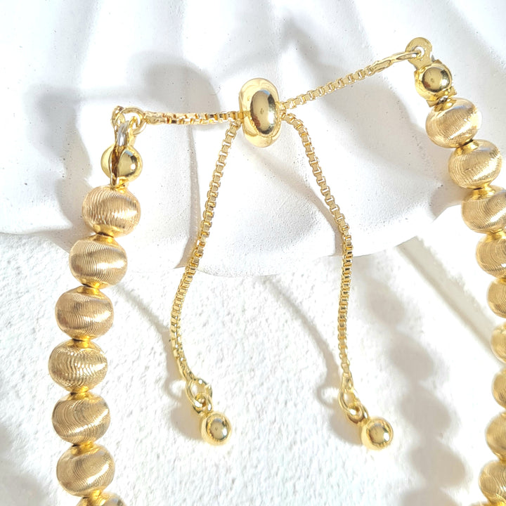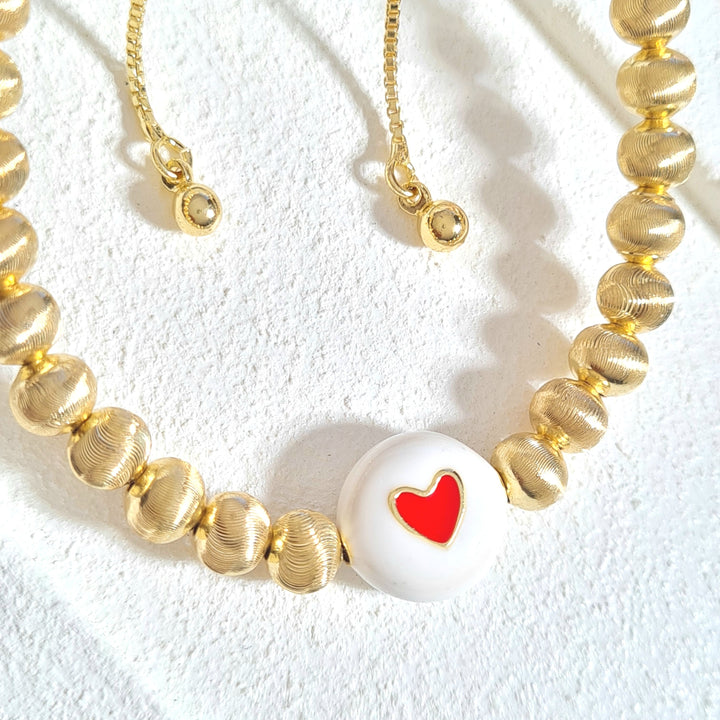 Pulsera con sistema ajustable en rodio, balines con textura, dije en forma redonda con corazón rojo