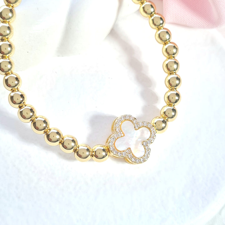 Pulsera en rodio, sistema ajustable, balines y dije en forma de trébol color blanco con detalles en zicones