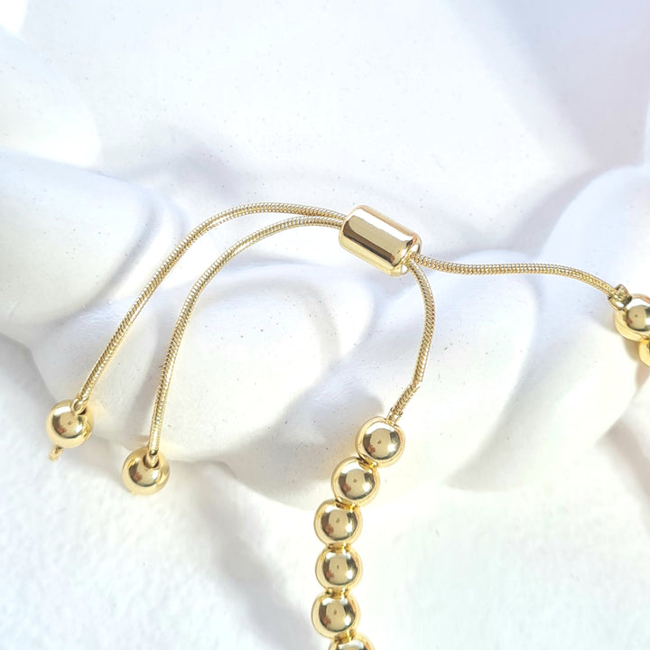 Pulsera en rodio, sistema ajustable, balines y dije en forma de trébol color negro con detalles en zicones