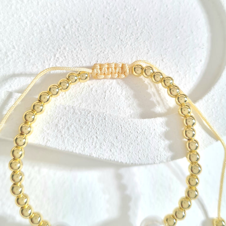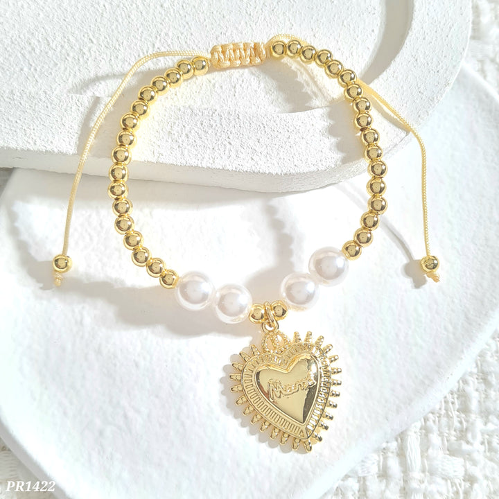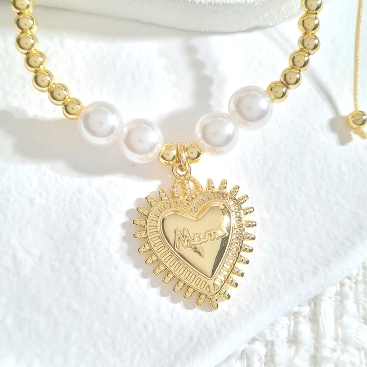 Pulsera en rodio con base en hilo, tejido de balines, sistema ajustable y dije en forma de corazón con palabra "Mamá"