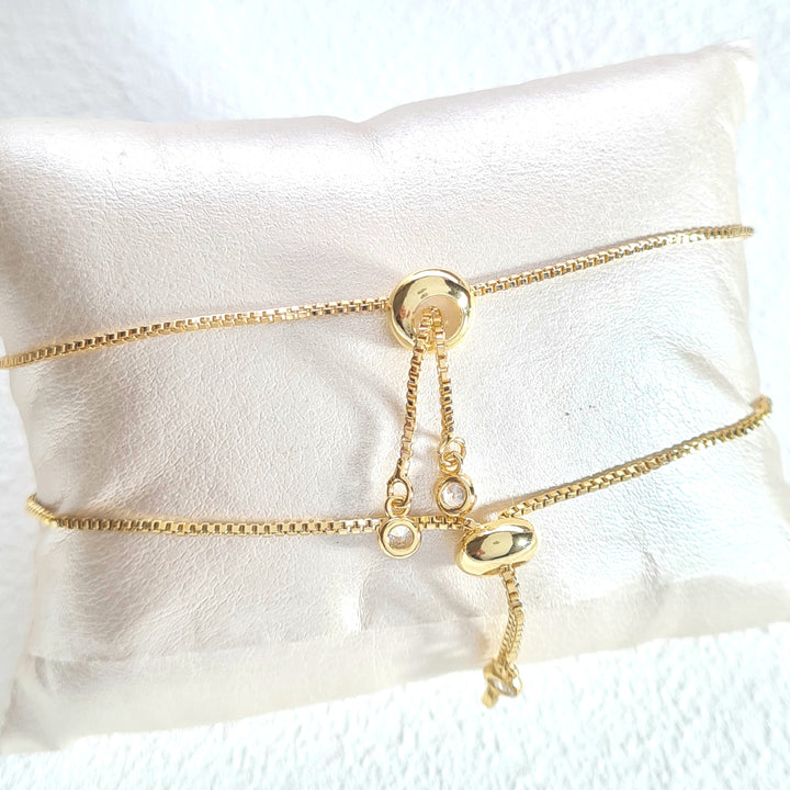Pulsera en rodio con sistema ajustable y dije en forma de corazones verdes con detalles en zircones