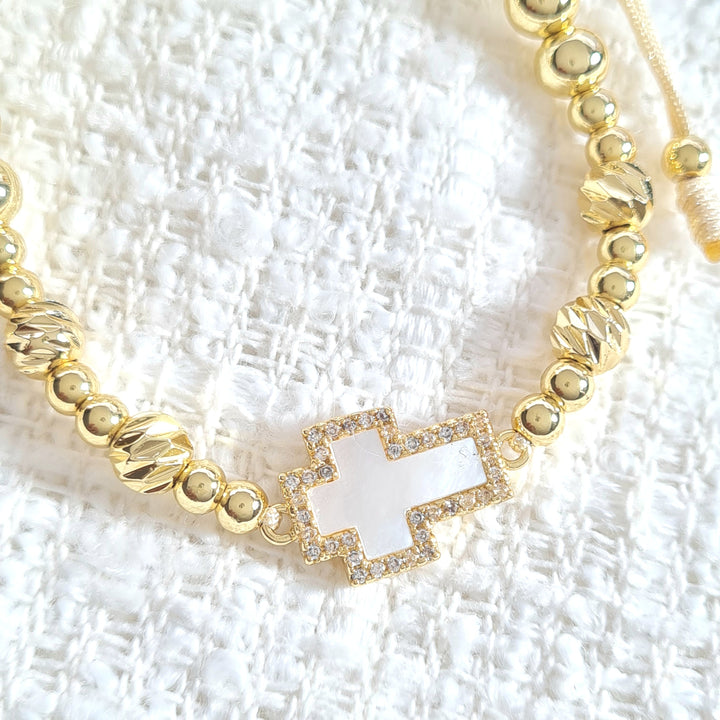 Pulsera en hilo, sistema ajustable con balines en rodio y dije en forma de cruz con nácar y detalles en zircones