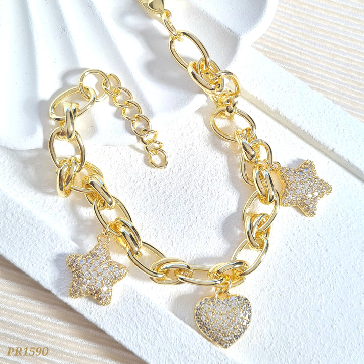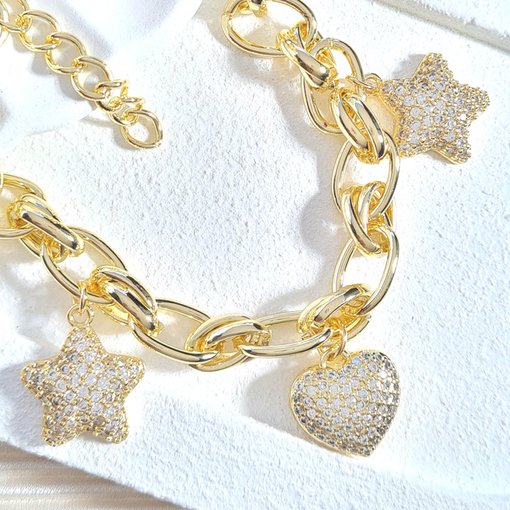 Pulsera en rodio, tejido eslabones, dijes con formas de estrellas, corazón y detalles en zircones