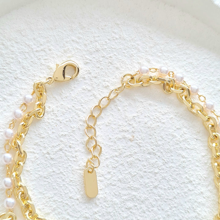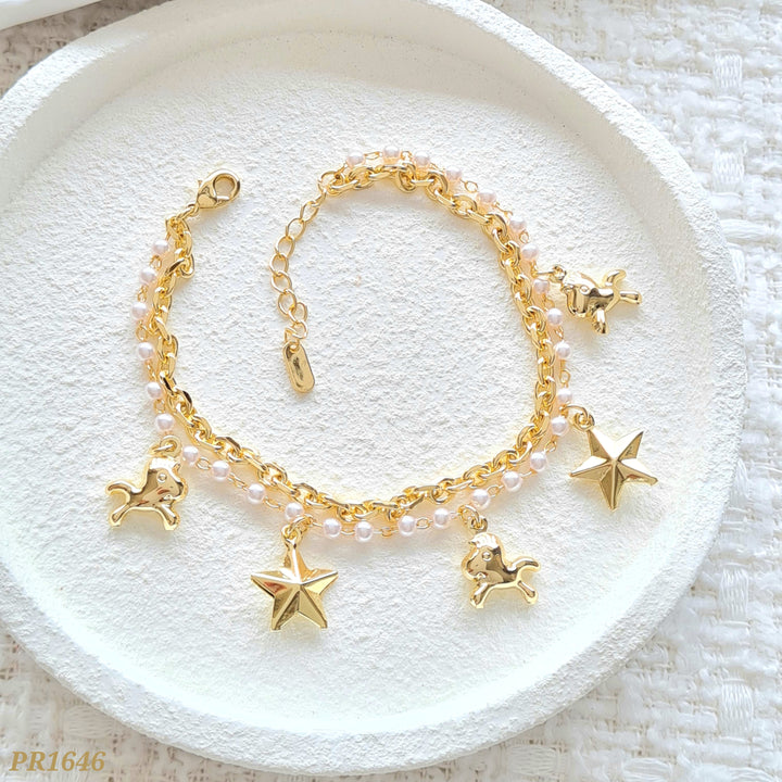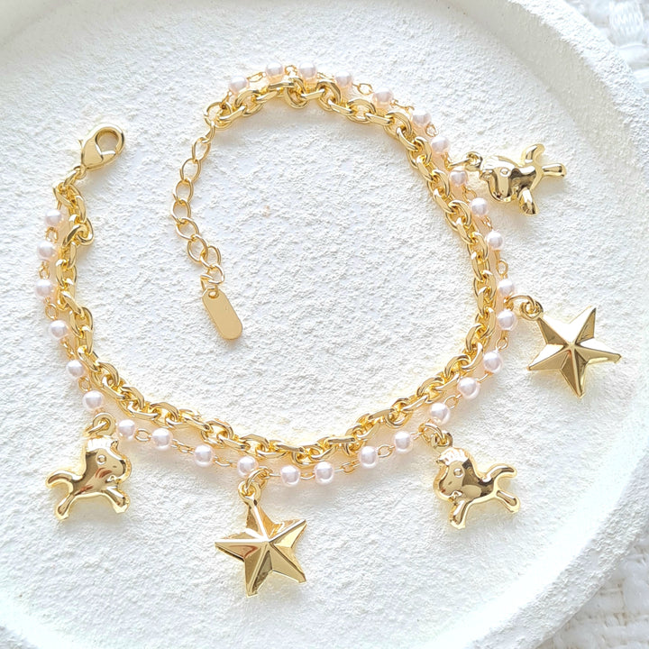 Pulsera rodio con tejido de eslabones, perlas, dijes en forma de unicornio y estrellas