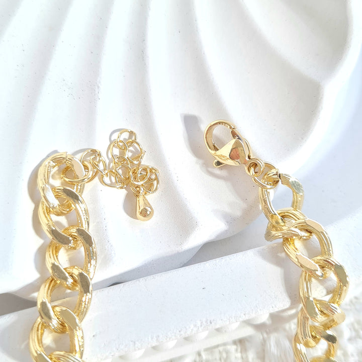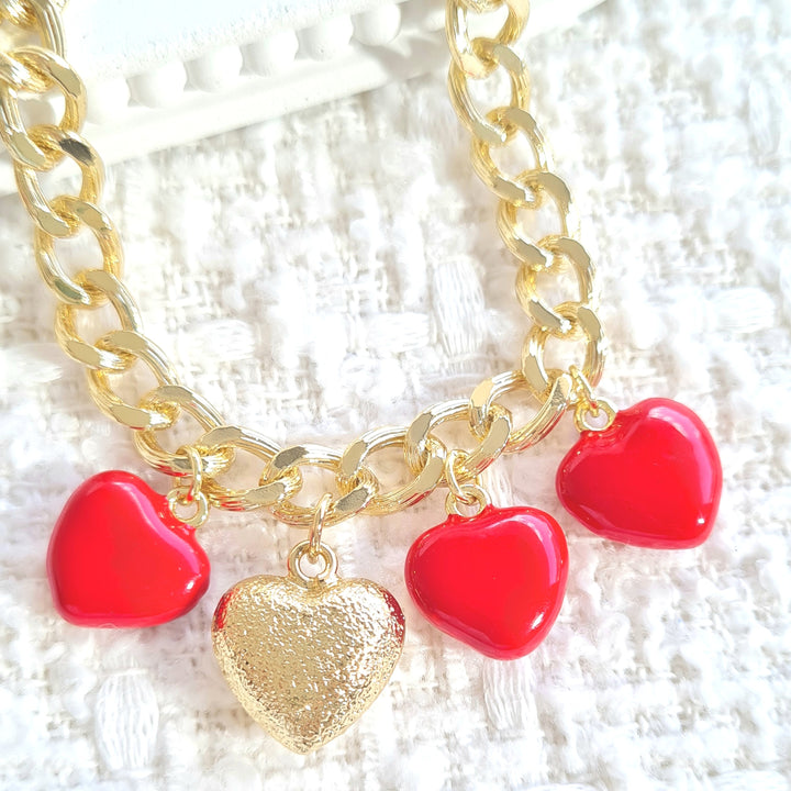 Pulsera en rodio con eslabones y dijes de corazones rojos