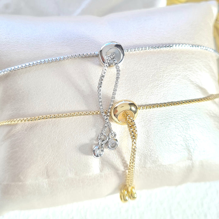 Pulsera en rodio con sistema ajustable y dije en forma de infinito plateado con detalles en zircones