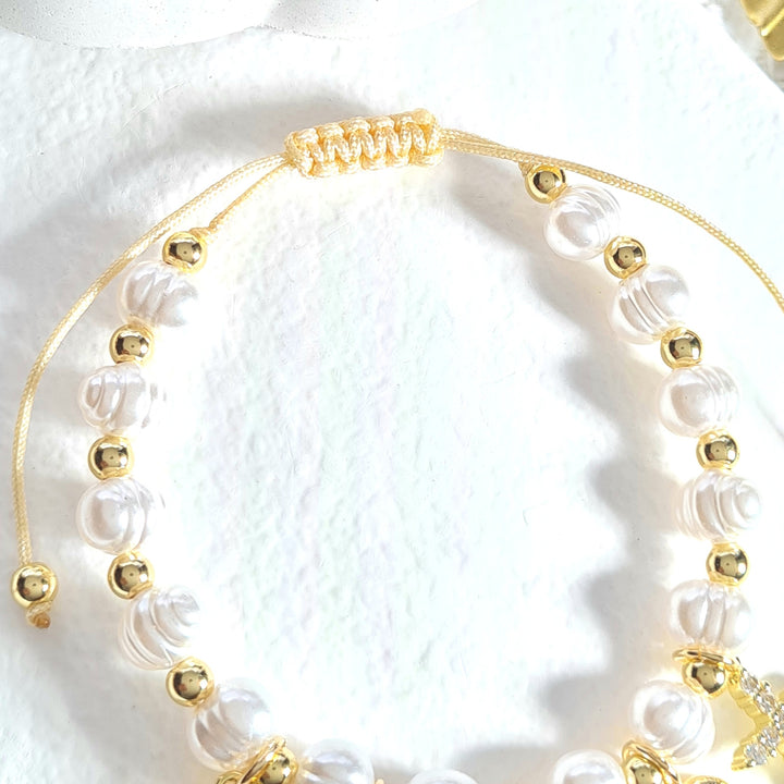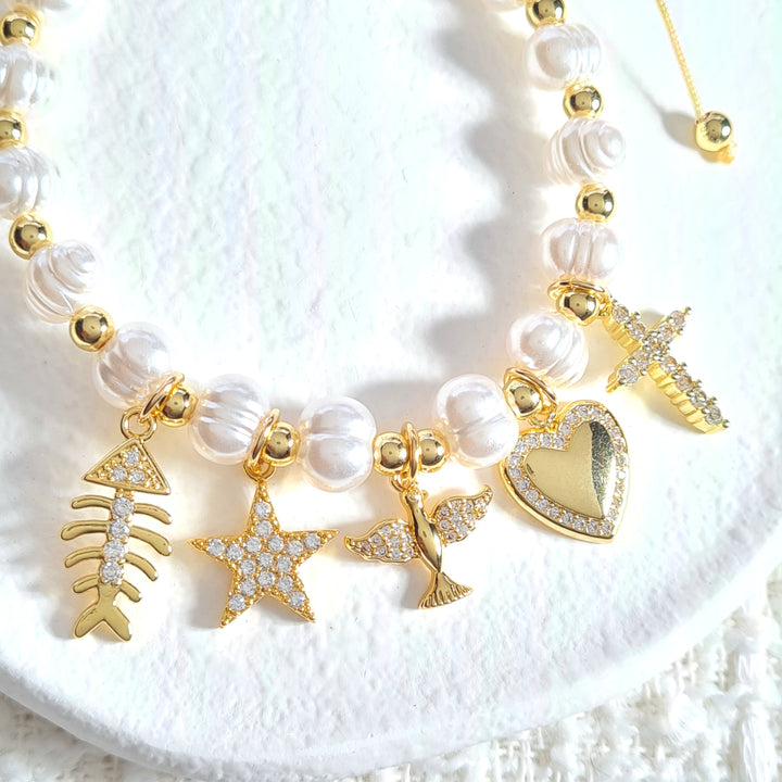 Pulsera en rodio con base en hilo beige, perlas con textura, balines y dijes en forma de pez, estrella, paloma, corazón y cruz con detalles en zircones