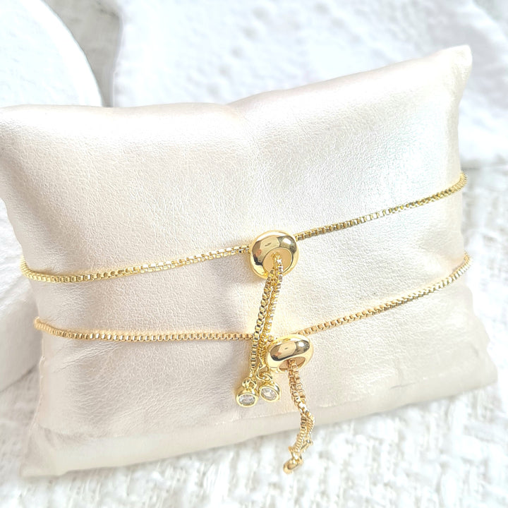 Pulsera en rodio con sistema ajustable, dije en forma de virgen en zircones