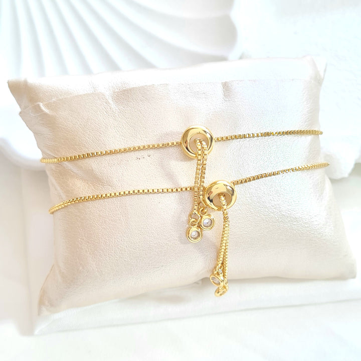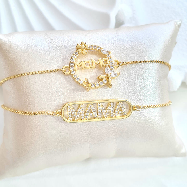 Pulsera en rodio con sistema ajustable, dije en forma redonda con palabra mamá y detalles en zircones
