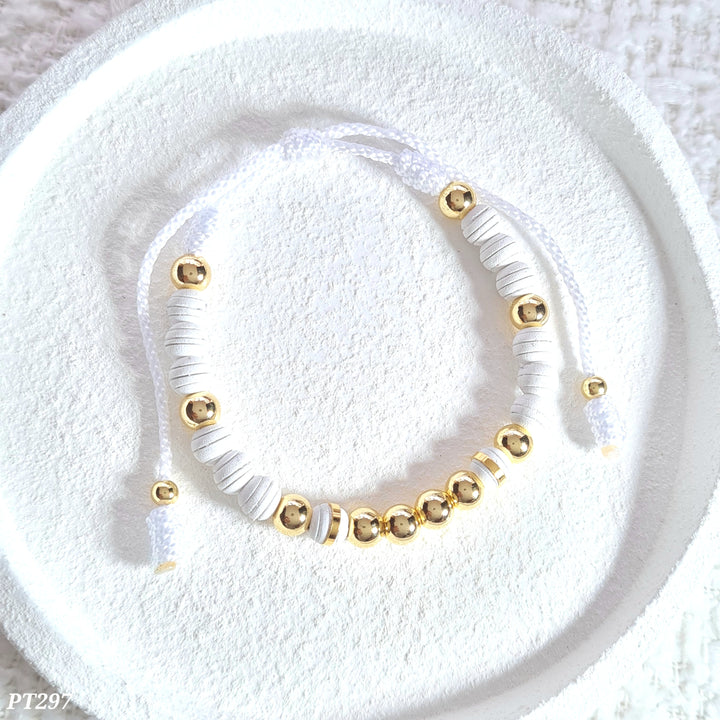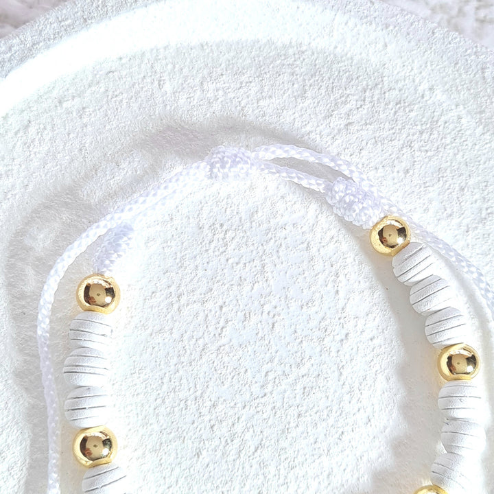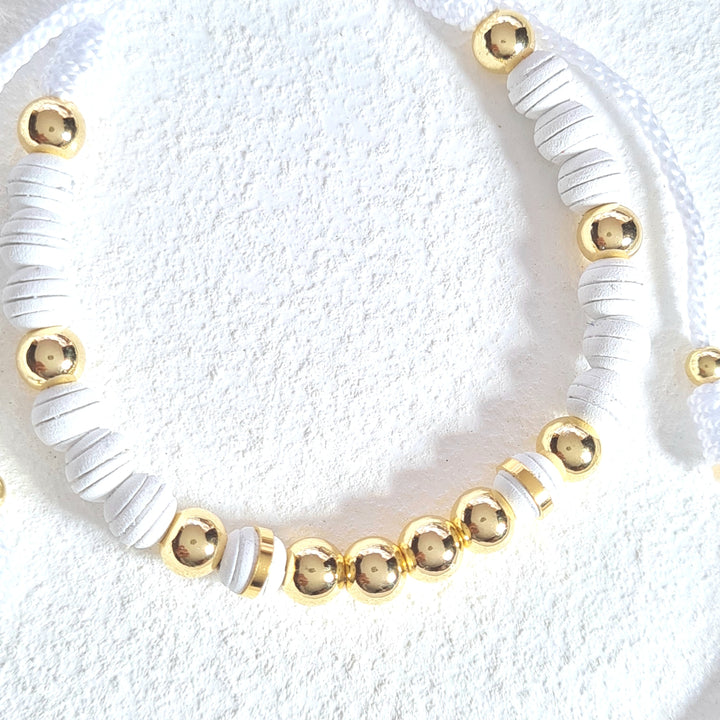 Pulsera tejida neopreno blanco balines dorados y arandelas dorados