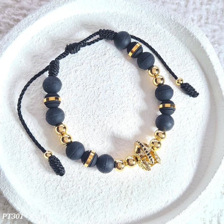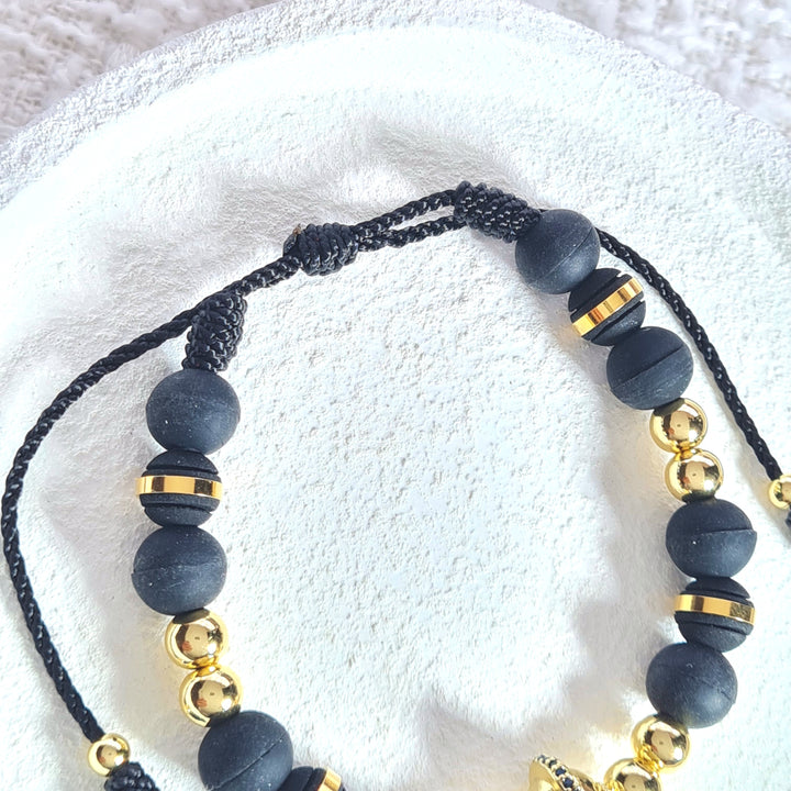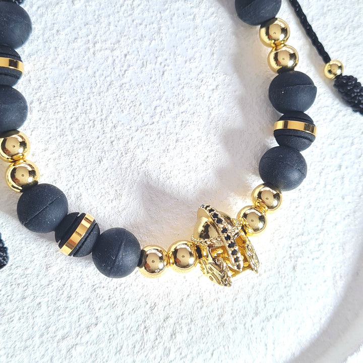 Pulsera tejida neopreno negro balines y arandelas doradas con dije en forma de casco gladiador