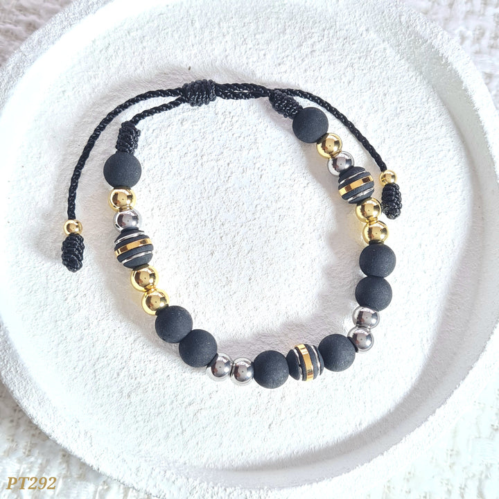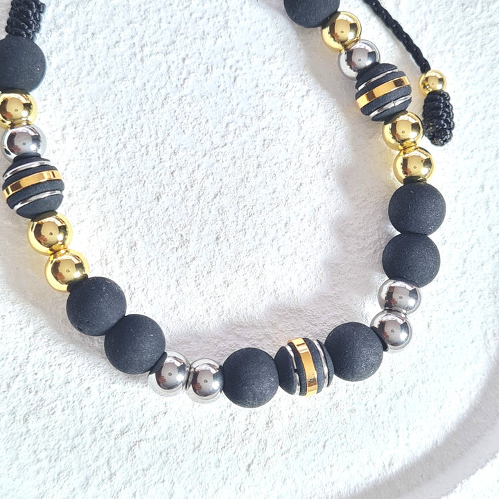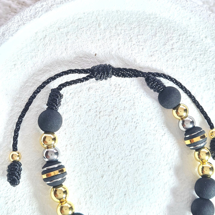Pulsera tejida neopreno negro balines bicolor y arandelas bicolor