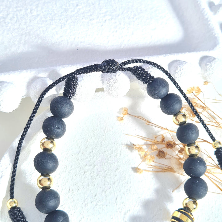 Pulsera tejida neopreno negro balines y arandelas doradas.