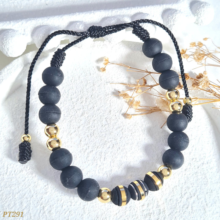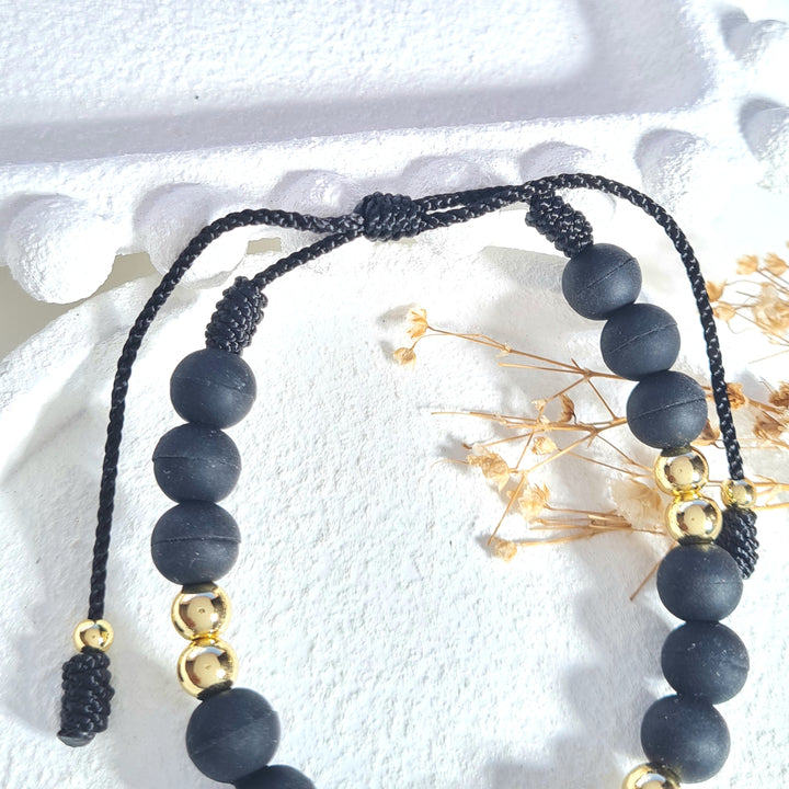 Pulsera tejida neopreno negro balines y arandelas doradas.